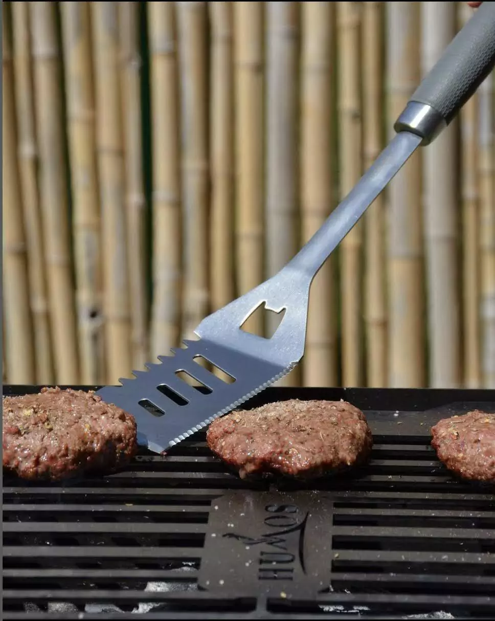 - 100% hechas de Acero Inoxidable - Largo ideal para Parrillas: 46cm - Abridor de botellas - Serrucho lateral para mover/sujetar piezas de carne en la Parrilla - Grip antideslizante para un agarre cómodo y frio - Anillo para colgar las herramientas